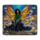 A fairy with orange and yellow wings sitting on stone steps that lead to perhaps the Fairy realm. The African American Fairy is not alone, she is with her guardian doberman dog on this Autumn Day.