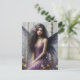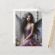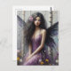 A fairy in a purple dress stands in a beautiful birch tree forest