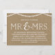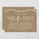 This pretty, rustic chic wedding rehearsal dinner invite features "Mr. & Mrs." written in vintage typography, a glowing string of heart-shaped lights, and a kraft paper style background.