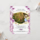 A beautiful and magical large tree with branches stretching outwards is surrounded by small magic fireflies and string lights. The tree is in a forest and has lush green foliage around it and pretty butterflies flying through the air. The forest scene is framed by a hexagonal faux gold geometric frame that has a pretty brunette fae or faery girl with pale yellow wings, wearing a blue summer dress, standing on the edge of the frame looking into the woodland. Pretty peony flowers form a border edge to this invitation. This is ideal for little girls mythical birthday parties; for adorable baby shower events and fairytale theme birthdays.