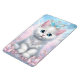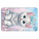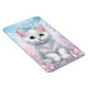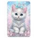 An adorable fairy princess white kitten with jewels, pink flowers and fairy wings on a sparkly blue background.