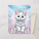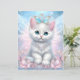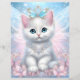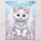 An adorable fairy princess white kitten with jewels, pink flowers and fairy wings on a sparkly blue background.