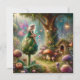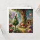 Blank card. The front is an ai watercolor illustration of a fairy sitting on an artichoke, next to a big tree, whimsical village, flowers and butterflies.