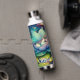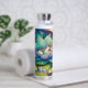 Personalised fairy water bottle. Cute little fairy sleeping on a lotus flower on a lily pad with flowers and mushroom background. Cute fairytale style illustration.