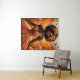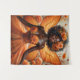This bold fantasy-themed tapestry features a dark-skinned Black fairy with afro hair among orange flowers. The color orange dominates this African fairy portrait, including the fairy's makeup, dress, earrings, floral crown, and wings. The vibrant, melanin-rich artwork is in an oil painting style.