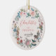 Vintage Alice in Wonderland fairytale baby girl's first Christmas ornament. The design features an elegant frame design with Alice in Wonderland characters, the mad hatter, Alice, the white rabbit, florals, butterflies, and fairytale tea party elements framing around the ornament. Personalise with the baby's name, your text, and year. The ornament's reverse side displays a photo placeholder within our heart crown and floral photo frame design to display your baby's photo beautifully. Designed by Moodthology.