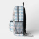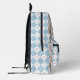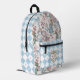 Vintage Alice in Wonderland character fairytale backpack. The design features Alice in Wonderland characters, the mad hatter, Alice, the white rabbit, florals, and fairytale tea party elements pattern designed on the front with the sides and front pocket designed with an elegant blue and white chequerboard pattern. Personalise with two two-letter monograms displayed within our heart crown crest design. Designed by Moodthology.
