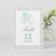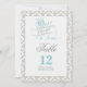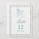 Once Upon a Time fairytale 2 sided table numbers card in aqua, grey, white & black colour scheme on a damask background.