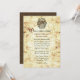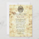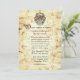 Aged looking fairytale wedding invitation done in an antique like paper, with flourishes down the left and right sides. Graphics of a crest with unicorns decorates the top of the invitation. The back of the invitation is done in a brown damask pattern. Personalise the text fields to suit your needs. Matching RSVP card is available.