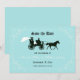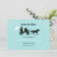 Fairytale wedding save the date cards with a bride and groom riding in a horse drawn carriage. Ornate frame on a robin's egg blue background. Perfect for your storybook princess wedding! Also available in other colours. Please contact pmcustomweddings@hotmail.com for custom colours. Matches our horse and carriage fairytale wedding set.