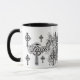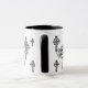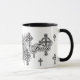 Faith and Crosses Religious Mug. Elegant flourishes in subtle greys and blacks are carried throughout this christian themed mug, a majestic cross in the middle and the words "Faith" on the sides. Ornate crosses all around the mug.