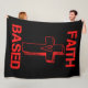 This fleece blanket has a design that features the words "Faith Based" in a bold print font with red letters plus cross with a heart in the centre in this faith based biblical quote theme. This Blanket is made from 100% buttery soft and cosy polyester fleece with edge-to-edge vibrant full colour sublimation printing and double edge stitching with a off-white coloured back machine washable.