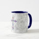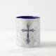 My original designed artwork is featured on this pretty mug, consisting of a vintage grey pattern for the background, given a slight distressed appearance, and a vintage style illustrated Cross of Faith in front. The handle and inside of the cup are a blue tone to complement the artwork.