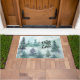 Beautiful doormat depicts a watercolor nature landscape with evergreen pine trees in the mountains. It features an inspirational quote, "Faith Hope Love."