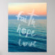 Hand Lettering "Faith Hope Love" Typography with a cross, peace sign and heart over a photo of an ocean sunset.