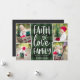 Rustic and festive holiday photo card features four photos in a collage layout, with "faith, love, family" in white hand lettered typography on a handpainted green and black buffalo plaid background. Personalize with your names beneath.