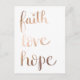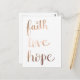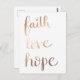 "Faith Love Hope" is hand lettered in gold foil on white postcard. Back is blank for personal messages, and address.