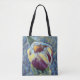 The front of the tote features a beautiful tulip flower in an artsy style, and the back has a vintage pattern with a bible verse from Psalm 90:17 so either side can be shown.