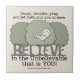 Little Boy is seen in a relaxed pose high in the treetops of the trees illustrating the quote above that reminds us to pause, breathe, pray and let faith put you at ease. The shapes of the trunks of these trees spell out the word, “BELIEVE” and the quote, “in the Unbelievable that is YOU!” below that completes David A. Carrizales’ well-known saying. Drawing is by Christie Black.