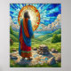 This stunning stained-glass-style piece portrays Abram in Genesis 15, standing before a stone altar, gazing upward with faith and awe. His flowing robes of red, orange, and white emphasize the moment’s sacredness, while the surrounding lush grass, distant hills, and a bright blue sky create a serene, pastoral setting. The intricate details of the altar and the circular frame with a black background highlight the timeless significance of Abram’s trust in God’s promise, making this artwork a perfect tribute to a key biblical moment.