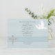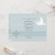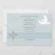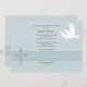 A textured, blue background is intersected by a blue ribbon and a decorative cross. On the top right corner, a white dove flies above. A lovely invitation for any religious celebration. br/>