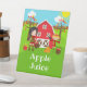 This cute and fun sign features a black hair girl with a basket of apples and a scarecrow and crow. In the background is a bright red barn, a brown picket fence, trees, sunshine, pumpkins and baskets of corn and apples. The text combines bold and sans serif fonts for a stylish and modern look. This is perfect for an autumn fall themed birthday party.