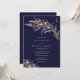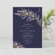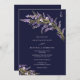 A chic Classic elegant floral lavender wedding watercolor with monogram initials featuring purple lavender botanical stems branches and flowers , green and brown foliage and elegant calligraphy on dark navy blue.