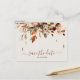 Elegant rustic country fall wedding save the date postcard featuring brown, red, orange, green eucalyptus leaves. Please contact me for any help in customisation or if you need any other product with this design.