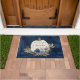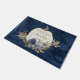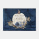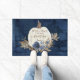 "Fall Autumn Pumpkin Navy Welcome Mat Family Name." Perfect as a hostess gift for a family that is sharing their home with you for the weekend or as a welcome mat for your invited guests! Personalised with your family's name and message this navy blue rustic wooden background with a white pumpkin and muted fall foliage in earth tones with dusty and navy blue flowers all painted in watercolor by Internationally licensed artist and designer, Audrey Jeanne Roberts, copyright all rights reserved.