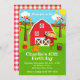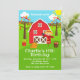 This cute and fun birthday invitation features a scarecrow and crow. In the background is a bright red barn, a brown picket fence, trees, sunshine, pumpkins and baskets of corn and apples. The text combines bold and sans serif fonts for a stylish and modern look. This is perfect for an autumn fall themed birthday party.