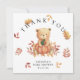 "Thank you". Celebrate with this teddy bear themed baby shower party! Watercolor cute teddy bear with an autumn pumpkin in its paws sits on autumn foliage.