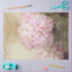 RIGHT SIDE image for cabinet doors or to create a pair of wall art images. Muted, late summer early fall garden, with dusty pink hydrangeas, a warm cream stucco wall, twig background and foliage. A gently autumn colour palette with softly faded colours. There is companion version of this design that does not have the handwritten script ephemera. Painted in oil pastels by internationally licensed artist and designer, Audrey Jeanne Roberts, copyright.