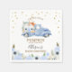 Sweet fall themed baby shower paper napkin for a baby boy baby shower featuring a blue truck with loaded with a pumpkin and floral arrangement. This boys pumpkin baby shower napkin also features some blue dots. A way to thank guests for coming to your autumn or fall blue pumpkin truck themed boy's baby shower.