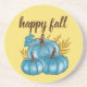 Classic fall blue pumpkins coasters! Trendy typography quote says "happy fall". Three cute and colourful blue pumpkins with autumn leaves. Fall gold background. Ready for your favourite drinks!