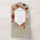 AVAILABLE WITH OR WITHOUT A QR CODE TO SCAN OR WITH OR WITHOUT DINNER OPTIONS. This all in one wedding invitation design features a beautiful fall inspired frame of rust, terracotta, peach, cream, brown and sage green with a white distressed sage green background. Perfect for a fall wedding. Created by Simply Farmhouse Press.