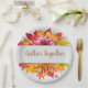 Beautiful Thanksgiving paper plate features autumn flowers and foliage with centre customisable "gather together" text in modern light brown font.