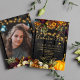 Beautiful rusty orange and dark burgundy autumn fall flowers and pumpkin borders with strings of golden twinkle lights over a dark brown barn wood background making a charming PHOTO graduation party invitation with a trendy handwriting gold typography script. +++++++++ Easy to personalise with your details and image on both sides! Suitable for traditional rustic | country | farmhouse | outdoor backyard family parties or barbecues.
