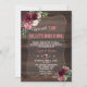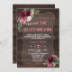 Rustic, Romantic card design featuring watercolour burgundy blush flowers bouquets, a semi-transparent shape with a textured frame, arrows with hearts and flowers as divider, all on an old barn background. Use Personalise tool to add your info. Matching items can be found in my Charming Floral Collection.