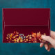 Add a festive seasonal touch to your wedding suite with this elegant fall envelope, featuring a rich burgundy background and watercolor autumn leaves in vibrant shades of orange, red, and gold. The back flap showcases a seamless design without a return address—ideal for hand-delivered invitations or custom addressing. Perfect for rustic and romantic fall weddings.