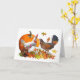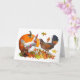 A trio of hens enjoy fall surrounded by coloured oak leaves, a big orange pumpkin and a bunch of ripe grapes on this autumn chicken card.