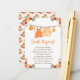This cute and fun watercolor book request enclosure card features a baby clothes line with orange floral arrangements. The text combines handwritten script and sans serif fonts for a stylish and modern look. This is perfect for an autumn fall baby shower.