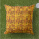 An outdoor throw pillow decorated with a fall-coloured, ceramic effect pattern.