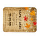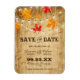 Fall Country Wedding Save the Date Magnet with String Lights and falling leaves on a wood graphic background. You can add your names, date, and location. Perfect for a country or rustic wedding. This design matches a collection in my store.