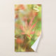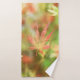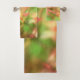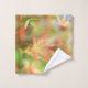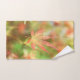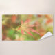 Against the backdrop of green summer leaves of a Japanese maple flushing to autumn reds and yellows, a rose and gold skeleton leaf drifts slowly down to the ground.