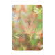 Against the backdrop of green summer leaves of a Japanese maple flushing to autumn reds and yellows, a rose and gold skeleton leaf drifts slowly down to the ground.