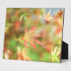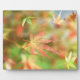 Against the backdrop of green summer leaves of a Japanese maple flushing to autumn reds and yellows, a rose and gold skeleton leaf drifts slowly down to the ground.