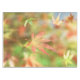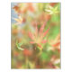 Against the backdrop of green summer leaves of a Japanese maple flushing to autumn reds and yellows, a rose and gold skeleton leaf drifts slowly down to the ground.