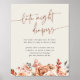 Add a little humour and heart to your fall baby shower with this 8x10 “Late Night Diapers” sign from Redwood & Vine Design Co. Guests are invited to write funny or uplifting notes on diapers for those late-night changes. With autumn florals and modern terracotta script, this sign is available printed or as a digital file to suit your setup.