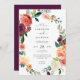 An elegant autumn wedding invitation featuring fall watercolor flowers and modern typography. The rustic floral frame includes roses and mums in pretty shades of cranberry red, maroon, peach, plum, and blush pink. Personalise with your wedding details for a modern, rustic wedding invitation. Part of our "Autumn Elegance" wedding collection.