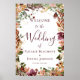 This is a modern autumn themed wedding welcome sign using bohemian and rustic watercolor botanicals and florals in tones of rust, terracotta, burgundy, deep greens and burnt oranges.